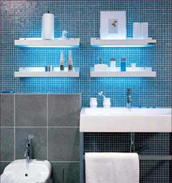 收納方式墻上的四個(gè)擱板既可以用來(lái)收納洗面、刷牙、漱口的用品,又可擺放裝飾畫(huà),還放置了衛(wèi)生紙。位于陶瓷的水盆下面的擱架能用來(lái)搭放毛巾。墻面既裝飾又實(shí)用地鑲嵌了四個(gè)擱板,非常好地利用了空間,并且四個(gè)擱板下面分別安裝了綠槽掛燈。當(dāng)燈光開(kāi)啟,光束映襯在翡翠墻上,不僅可以反射照明,也讓墻面看上去更加漂亮,碧綠如翡翠。