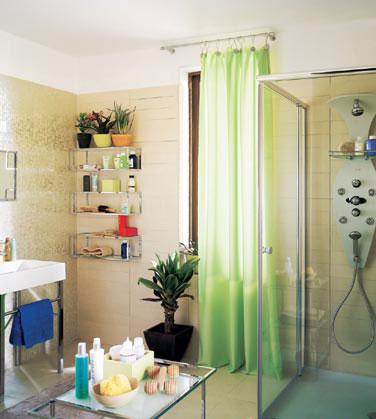 衛(wèi)生間選擇不同顏色的窗簾,可以營造出不同的空間效果。綠色的窗簾讓白色衛(wèi)生間感覺更加清新,也讓整個環(huán)境的氛圍更加清透,又能中和金色馬賽克墻面張揚的個性色彩,讓衛(wèi)生間更具令人身心愉快的生活氣息。