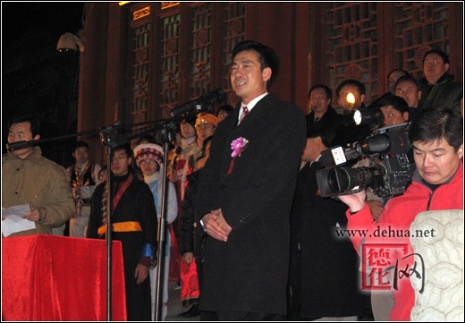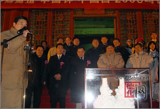 國(guó)家文物局局長(zhǎng)單霽翔、北京市文物局局長(zhǎng)孔繁峙、中國(guó)非物質(zhì)文化遺產(chǎn)保護(hù)中心副主任謝克林、中國(guó)通俗文藝研究會(huì)秘書長(zhǎng)馮乃華、中國(guó)陶瓷工業(yè)協(xié)會(huì)秘書長(zhǎng)黃芯紅、泉州市委常委、常務(wù)副市長(zhǎng)廖小軍、縣長(zhǎng)李輝躍、副縣長(zhǎng)黃耀昆、曾憲堡、大鐘寺古鐘博物館館長(zhǎng)解小敏、古鐘博物館書記吳志友、中國(guó)社會(huì)科學(xué)院研究員丁守璞及社會(huì)各界人士千余人出席了大典活動(dòng)。廖小軍、李輝躍在大典儀式上發(fā)表了熱情洋溢的講話,代表泉州市和瓷都德化祝福北京2008奧運(yùn)會(huì)圓滿成功,祝福北京市民幸福安康。