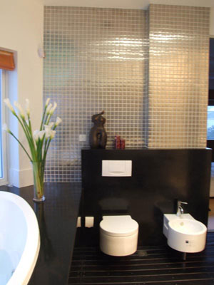 6.衛(wèi)浴空間大面積使用金屬馬賽克,和玻璃鏡面、貼花隔斷相得益彰,明快高調(diào)的表現(xiàn)將壓抑煩累一掃而空。