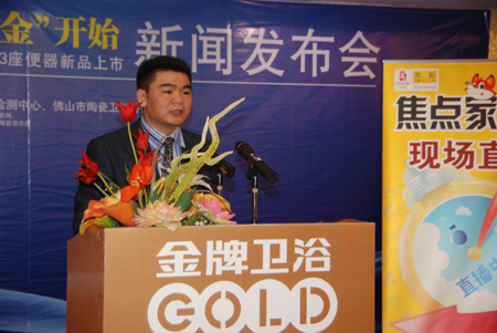 今天可謂是高朋滿座,有來自于行業(yè)內(nèi)的領(lǐng)導(dǎo)和專家,還有媒體朋友們。2008年對中國人是值得慶祝的一年,對金牌潔具有限公司的人來講,也是一個吉祥喜慶的時刻,請允許我宣布"節(jié)約用水,從"金"開始,金牌衛(wèi)浴4(+)升超級節(jié)水王2093新聞發(fā)布會現(xiàn)在開始!"