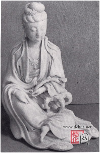 觀音像是德化窯的常見題材之一,何朝宗則是明代中后期德化窯瓷塑名家,最善于用表情傳神以及用流暢的衣紋展現(xiàn)風(fēng)姿。完全中國化了的觀音,其靜美柔曼的風(fēng)韻以德化瓷細(xì)膩的質(zhì)地和獨(dú)特的象牙白來表現(xiàn),在作者出色的創(chuàng)造中更顯得恰當(dāng)不過。倚著獸頭憑幾,手持如意,非屬“觀音菩薩三十三現(xiàn)”中的一種——明清時代的觀音不僅早已改變了性別,其形象距離佛典教義也已經(jīng)很遠(yuǎn),而多半只是人們賦予了想像和期待的美善與圣潔的化身。