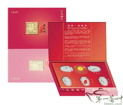 超大禮茶之巖韻·五福茶精選武夷頂級巖茶(大紅袍)配以德化名瓷,以五福臨門、富貴吉祥為產(chǎn)品訴求。精美的德化瓷裝極品大紅袍和武夷四大名樅:水金龜代表長壽,大紅袍代表富貴,肉桂代表康寧,鐵羅漢代表好德,水仙代表吉祥(善終);五福茶借五福臨門之意,與北京奧運(yùn)五福娃相呼應(yīng),融合傳統(tǒng)文化,把握時代脈搏,造就茶中“五福”。巖茶生于峭壁,巖韻巖骨花香,采天地之靈氣,集日月之精華,福壽富貴,亙古長存。