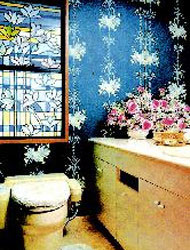 這個衛(wèi)生間看上去成熟、典雅,這種印象來自于材質(zhì)高檔的潔具、純白的大理石臺面、藍底白花的墻紙和荷花圖形的貼窗紙。