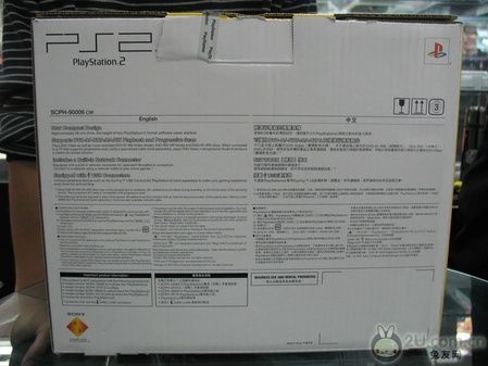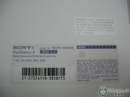此款PS2包括90006陶瓷白主機一臺,原裝有線振動手柄一只,電源插頭一根(220V電源適配器已內(nèi)置),AV端子線一根,價格僅為1150元。玩家們可以看出機身中央的盤片艙蓋邊緣處,磨砂裝飾線條已經(jīng)消失不見,取而代之的是上蓋面板全部采用鋼琴烤漆,并且出廠時的密封保護貼膜還吸附在面板之上。機身背面銘文注明了機器型號SCPH-90006,顯示制式為美式NTSC制式,區(qū)域語言為Japan日本。銘文右上角淺色文字采用特殊油墨印刷,實為機身螺絲保護封簽,如果被拆開動過手腳的話,淺色文字就會破碎變色,之前在PSP主機電池艙蓋處也采用了類似的防護措施。