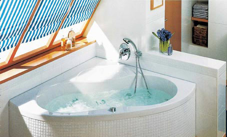 如果衛(wèi)浴間是全落地式斜屋頂或者是斜屋頂下方特別低,這時(shí)候可以選擇適合角度的三角形浴缸。這樣就避免了傾斜的角度,大大提高了其舒適性。