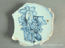 這枚瓷片上,所繪畫的老壽星圖案,筆者認為,它就是一幅比較典型的藝術(shù)佳作。該圖立意清新、構(gòu)思巧妙,畫師不惜工時,采用了文圖結(jié)合的抽象和夸張手法,在一個頗有藝術(shù)性的“壽”字里,只用那么寥寥幾筆,便刻畫出了一位聰明伶俐、生動活潑、已返老還童的“老壽星”形象。該盤底直徑為8厘米,圈足向內(nèi)傾斜、底足內(nèi)施釉無款,釉色白中微有泛青。根據(jù)以上諸多特征,參照有關(guān)資料說明,筆者初步判斷此物應(yīng)屬于明朝弘治期的產(chǎn)品。因為弘治期的民窯圖案在前朝的基礎(chǔ)上更為豐富,具有布局舒展、繪畫工細的特點;且有雙勾填色之作。同時,較工細的描繪也達到了民窯瓷繪的高峰。