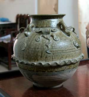 記者在大漠古玩城一古玩店中見到了一款青釉四系堆貼蛙紋罐,此罐高22厘米,口徑11.8厘米。去年4月,在呼和浩特市舉辦的一次鑒寶活動中,首都博物館原常務(wù)副館長、中國文物學(xué)會鑒定委員會委員張寧斷定此罐為西漢時的產(chǎn)物,并且這樣鑒評:此物唇口外翻,肩附四系,并且堆貼四只蛙紋,上施青釉,下部露胎,呈現(xiàn)橫弦紋,胎色呈紅褐色,釉面流淌,塑雕紋飾技法老練,是我國優(yōu)秀的青釉制品。