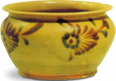 此盂于湖南省長沙縣出土。大口矮領(lǐng),碩腹平底。胎體呈褐紅色,胎上罩一層白色為底,既掩蓋了胎面上的瑕疵,又增強(qiáng)了彩繪母題的效果,這便是瓷器中慣常使用的化妝土技法。在化妝土上,以含鐵、銅成分的顏料勾畫出幾組極似飛鳥的蔓草,然后于整個器表施一層青黃色彩。這便是著名的唐代長沙窯釉下彩繪瓷器。