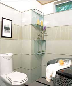 整體風(fēng)格:因?yàn)樾l(wèi)生間本身不大,所以這套衛(wèi)生間的墻面采用了高反光的玻璃材質(zhì),地面也用了高拋光的瓷磚,配合以明亮的燈光,衛(wèi)生間看起來大了不少。不銹鋼的面盆、龍頭、透明的淋浴間使整個(gè)衛(wèi)生間極富現(xiàn)代感。