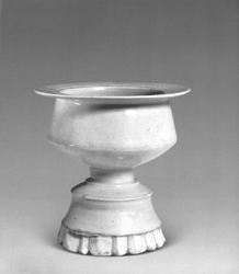 每當(dāng)我手持這尊宋代白釉瓷爐,總是覺得沉甸甸的,那倒不是由于器物的貴重,而是面對它就會心緒沉郁:該古瓷收藏有年,卻還未給它準(zhǔn)確命名。曾經(jīng)翻閱有關(guān)圖籍,對我那件類似藏瓷的器名,也是眾說紛紜:有的稱之為喇叭足燈,有的稱之為高足杯,有的說它是熏爐,有的說它是杯式爐。我推敲上述名稱,不以為然:稱燈稱杯,是望形猜說;稱爐果然沒錯,但略顯籠統(tǒng),沒有針對它的獨(dú)特形制,點(diǎn)明其特定用途。