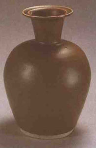 北宋和金代定窯瓷器中的褐釉品種。主要器形有碗、杯、盤、碟、瓶等。根據(jù)窯址調(diào)查發(fā)現(xiàn),曲陽澗磁村中心窯場(chǎng)出現(xiàn)紫定瓷片的范圍很小,說明宋金時(shí)代生產(chǎn)數(shù)量不多,品種也不能和白定相比。紫定器形精巧玲瓏,白胎,有的很細(xì)膩,百的稍粗糙、但仍比粗瓷細(xì)得多;釉層薄,釉面均勻光亮而平整,有的為柿紅色、有的作褐紅色,有的為灰褐色。紫定一般沒有裝飾,少量制品和黑定一樣,用金彩繪盛開的牡丹花紋。(見下圖)