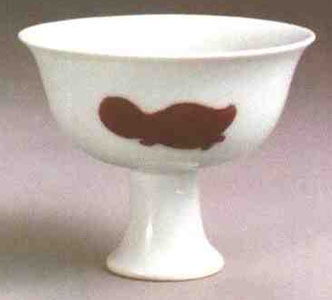 即“填紅”釉。一般是將器表上好的白釉剔去,填以霽紅釉,成三魚(yú)、三果紋樣。燒成后,紋樣渾然—體,呈色鮮紅,汁水晶瑩,圖案凸出釉面,有時(shí)擴(kuò)展到白釉下面,好象從胎骨內(nèi)燒出。后人誤以為是紅寶石末入釉所燒,故名“寶燒”。明永樂(lè)、宣德始有,常見(jiàn)品種有寶燒三魚(yú)、三果高足杯和永樂(lè)梨形壺。清雍正、乾隆有仿永、宣寶燒器,但與明代不同,其霽紅釉是完全的石灰釉,含氧化鈣很高,鉀、鈉低,故釉層薄而勻,紋樣無(wú)凸出效果。(見(jiàn)下圖)
