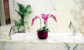 “水落石出”有乾坤如果不是有個(gè)水龍頭,乍看上去,記者還真不知道原來(lái)這是洗手盆!洗手盆的表面幾乎是平的,洗手盆中間放著一盆花,上面有兩個(gè)水龍頭,除此之外,別無(wú)他物。記者仔細(xì)觀察后發(fā)現(xiàn)看似平整的表面有那么一丁點(diǎn)兒向中間傾斜,水流流到中間的花盆便“消失”了。