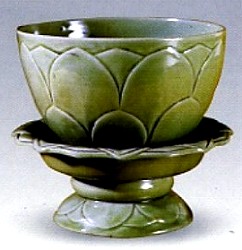 盞托連為一體,為唐至宋時(shí)期典型茶具。通體施青釉,釉色瑩潤(rùn),光潔如玉,系五代吳越國(guó)錢(qián)氏秘色窯燒造,奉至蘇州虎丘云巖寺塔供佛。通體飾大蓮瓣紋,花紋與器型達(dá)到完美統(tǒng)一。
