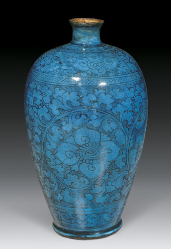 “孔雀藍(lán)釉”屬于西亞地區(qū)的傳統(tǒng)釉色,其制品在唐宋期間的商貿(mào)往來(lái)時(shí)被帶到中原并在金、元民窯中陸續(xù)制作。大同金代閻德源墓出土的一對(duì)孔雀藍(lán)黑花玉壺春瓶是我國(guó)較早期的孔雀藍(lán)制品。從金、元產(chǎn)品工藝看,13世紀(jì)的磁州窯系翠藍(lán)器(圖4-1)水平相對(duì)較高,至今有不少繪畫精美的“翠藍(lán)黑花”器存世。(編者注:隨著桂林明靖江王陵墓群出土孔雀藍(lán)黑花梅瓶實(shí)物面世,結(jié)合器形演變,以往定為元代的一些孔雀藍(lán)黑花器被現(xiàn)今研究界明確定為明代產(chǎn)品。)需要特別指出,有關(guān)學(xué)者根據(jù)科學(xué)成分分析發(fā)現(xiàn)該類制品使用低溫石灰釉,與我國(guó)傳統(tǒng)上以氧化鉛為助融劑的低溫釉配方并不一致,因此推斷該類色釉極可能是引進(jìn)西亞地區(qū)的原始配方,這也解釋了孔雀藍(lán)釉的原始起源問(wèn)題。