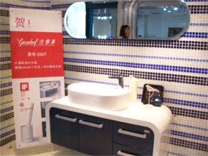 艾詩(shī)套系展示在一個(gè)衛(wèi)浴單間里。四周貼滿藍(lán)白黑相間的墻磚,非,F(xiàn)代時(shí)尚。位于一側(cè)的易拉寶提醒顧客們這是一款獲得了iF設(shè)計(jì)大獎(jiǎng)的作品,顯得喜氣洋洋。