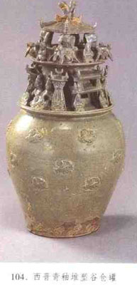 又稱谷倉、喪葬罐、魂瓶,由東漢五聯(lián)罐發(fā)展而來,是專為陪葬燒制的冥器,流行于三國吳、兩晉時期,有陶、瓷制品。南京博物院收藏有東吳風凰二年(273年)紅陶準塑人物飛鳥谷倉罐,主體為唇口式深腹罐,佛像、麒麟、朱雀、鋪首銜環(huán)等紋飾貼塑于罐腹四周,口部有雙闕、人物、鳥雀等,頂部有倒置直墻洗式蓋。北京故宮博物院收藏的青瓷谷倉罐最有代表性,罐口部不僅有雙闕、樓閣、人物、鳥獸等貼塑,罐的肩部還有伏龜馱碑,碑文有“永安三年”紀年。1978年浙江慈溪鳴鶴瓦窯頭出土的西晉堆塑谷倉罐,造型雖然與上述二例相似,但罐上部的堆塑著重表現(xiàn)了豪門貴族生前居住的城堡式樓閣建筑,在莊園門前有歌舞伎樂俑,以及飛鳥、牲畜等。(見圖104)