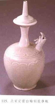 佛教憎侶“十八物“之一,游方時可隨身攜帶以貯水或凈手。它淵源于佛國印度,后隨佛教傳入中國、日本、朝鮮及南洋群島諸國。梵語音為“捃雅迦”、“君遲”、“軍持”,中譯為瓶或澡瓶。瓷質(zhì)凈瓶流行于唐、宋、遼時期。造型為管狀細(xì)長頸,頸中部凸出如圓盤,長圓腹,圈足,肩部上翹的短流多作瑞獸首形。元、明以后多稱“軍持”。器身多扁圓,頸較短,流肥碩。入清以后,這—器形為皇家壟斷,演變?yōu)橹鳖i,豐肩.?dāng)扛,高圈足外撇如蓋展開,無流,成為清朝廷賜給西藏高級僧侶插草供佛之物、故又改稱“藏草壺”。(見圖115)