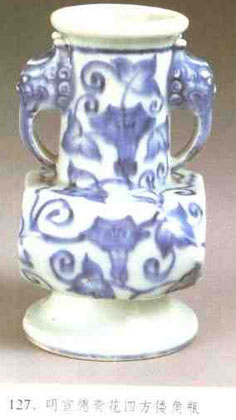 瓶式之一,是明宣德時期景德鎮(zhèn)御器廠創(chuàng)制的新器形。形狀為唇式口微侈,直頸兩側(cè)貼塑曾耳,方形腹的每個直角均斜削45度,使之變?yōu)榘死忮N形,圈足外撇。清雍正御窯廠仿品造型與宣德器相比,瓶體較大,且書有雍正官窯款。乾隆朝仿品底足較矮,獸耳小。明末清初時無款仿品有的可達亂真程度。(見圖127)