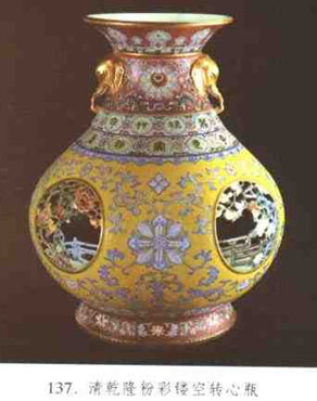 瓶式之一,流行于清朝乾隆時(shí)期。器形有大、小之分。瓶體由內(nèi)瓶、外瓶、底座分別燒制組成。內(nèi)瓶上部是外露的瓶口,瓶身似筒狀,上有裝飾繪畫(huà),瓶底有內(nèi)凹的軸碗。一般外瓶鏤空,形狀似燈籠,內(nèi)、外瓶套合后放在瓶座上,座上的立軸嵌入軸碗,手持瓶口轉(zhuǎn)動(dòng),內(nèi)瓶可隨之旋轉(zhuǎn)。瓶體上的圖案如走馬燈般可通過(guò)外瓶鏤空處看到。清未民國(guó)時(shí)期有仿清乾隆時(shí)期的制品。(見(jiàn)圖137)
