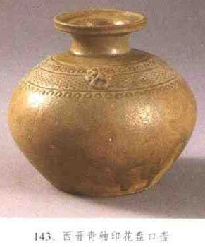 壺式之一?谘厣险,口形似盤,長頸,球腹,平底。造型源于西漢的喇叭壺,其時部分器物口頸轉(zhuǎn)折處已呈現(xiàn)棱線,至東漢初棱線凸起.初具盤口,中期后定型。此器自東漢流行于初唐,器身由矮小向高大演變。肩部通常飾雙系或四系,東漢為環(huán)形,三國、兩晉呈橋形,隋以后漸成條狀。(見圖143)