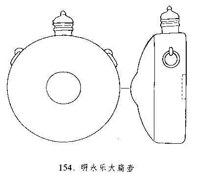 壺式之一。明永樂(lè)時(shí)期創(chuàng)燒、小直口、頸部凸起一棱,并有一小系,有蓋。壺身為立扁圓形,正面微鼓,中心有圓形凸臍;背面平坦、中有相應(yīng)的圓形凹臍。底部為弧面。左右肩部各有—活環(huán)系。均為青花制品。正面凸臍上多繪八角星紋。外圍有的繪纏枝蓮,邊緣為海水紋,側(cè)壁一周繪纏枝蓮紋。背面無(wú)紋飾。器形仿西亞金屬器皿.其用途有待考證。(見(jiàn)圖154)