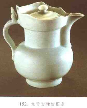 一種壺式,因壺口形似僧帽而得名。壺口沿上翹,前低后高,鴨嘴形流,壺蓋臥于口沿內(nèi)束頸,鼓腹,圈足,曲柄。最早的僧帽壺為元代景德鎮(zhèn)青白釉器,明永樂、宣德紅釉及甜白制品最為珍貴,清康熙年間仍有仿制。元代僧帽壺形體敦實,壺頸較粗,壺流略短。明代造型秀美,各部位比例勻稱,壺流比元代略長。清代壺頸略高,腹部略瘦,壺流略短于明代,沒有明代優(yōu)美,也不如元代制品敦實穩(wěn)重。(見圖152)