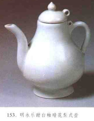 壺式之一,始于元代,流行于明,因形狀似梨而得名。傘形蓋,蓋頂有寶珠鈕,短頸,其下漸豐成下垂的圓腹。矮圈足,彎流,曲柄。從北京元代遺址中出土的青花梨式壺看,其特點(diǎn)是頸部較細(xì),腹部碩圓,平底。北京豐臺(tái)區(qū)出土的洪武時(shí)期梨式壺腹部略瘦,腹下部明顯內(nèi)收,圈足外撇,足邊垂直,足內(nèi)較深。江西景德鎮(zhèn)御窯廠遺址出土永樂壺頸較粗,圓腹,圈足向外侈,整體造型端莊。宣德時(shí)期,壺腹略短、圈足增高。頸與蓋上的寶殊頂比永樂略大。成化時(shí)期除繼續(xù)沿用傳統(tǒng)形式外,在壺蓋頂部出現(xiàn)微小的變化,增添平蓋形式。此式影響到正德時(shí)期,清康熙時(shí)期亦有摹擬之作,其器挺拔肥碩,唯柄曲線欠流暢。(見圖153)