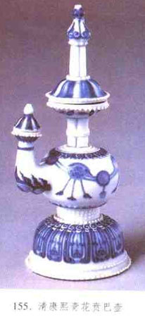 壺式之—,流行于清代,由藏族金屬制品演變而來。器形為洗口、束頸、球形腹,高足外撇,腹部有龍首形流彎曲向上,無柄是一種祭祀用品。(見圖155)