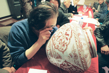 官窯瓷盤的出現(xiàn)讓現(xiàn)場掀起了一個(gè)小小高潮。上午11時(shí)30分,在多名保安人員的護(hù)衛(wèi)下,一件大連收藏者的巨大古瓷瓶出現(xiàn)在會場主席臺上。這件瓷瓶出現(xiàn)后,6位主持鑒寶的專家立即圍攏上來,這件瓷瓶成了會場的焦點(diǎn)。