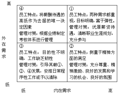 “第四種高外在需求、低內在需求的員工看重的是物質需求的滿足,這個時候薪酬待遇的高低就成為‘激勵因素’,而工作氛圍、工作環(huán)境、發(fā)展和學習的機會屬于‘保健因素’,可根據(jù)其工作業(yè)績制定相應考核體系進行管理。”