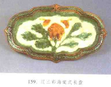 遼瓷典型器之—。全器若海棠花形,盤面較扁長、折沿、淺腹、平底,多以三彩印花裝飾。瓷制品源于木制餐具。這種器物也常見于遼墓壁畫。(見圖159)