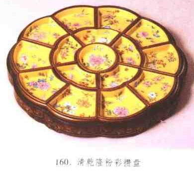 始于明代萬(wàn)歷朝,延續(xù)至清末的成套餐具。以分割成數(shù)件的盤(pán)或碗相攢組合為一個(gè)整體.故名攢盤(pán)或攢碗,又稱(chēng)全盤(pán)、全碗。用以盛裝不同的小菜或果點(diǎn)。按其件數(shù)區(qū)別,又稱(chēng)為“五子”、“七巧”、“八仙”、“九子”、“十成”。外部多以各種質(zhì)地的套盒相盛。(見(jiàn)圖160)