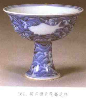 杯式之—。撇口、弧腹,下承以高足若把柄,故俗稱“把杯”。因執(zhí)行手中便于在馬上飲灑.又名“馬上杯”。用于佛前供奉者,稱“凈水碗”。有陶、瓷質(zhì)之分。陶質(zhì)高足杯以龍山文化黑陶高足杯最為著名。瓷質(zhì)高足杯始見于隋、唐、源于同時期的金銀器。明顯受到西亞文化的影響,后成為元、明、清時期流行的器形。景德鎮(zhèn)窯、龍泉窯、德化窯、鈞窯、磁州窯、耀州窯、霍縣窯、介休窯等處都大量生產(chǎn)。元代的高足杯,垂腹多較淺,足高長,且有八方、轉(zhuǎn)心、竹書柄各式。1980年江西高安窖藏出土的元代釉里紅彩斑高足杯、杯底有上小下大的圓錐狀榫嵌入圈足內(nèi),圈足上方有微內(nèi)收的榫,能使杯旋轉(zhuǎn)。明以后的高足杯增加菱花口式。(見圖161)