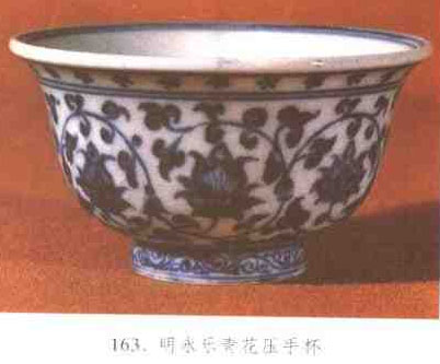 明代永樂朝景德鎮(zhèn)御窯廠創(chuàng)制、為皇室內(nèi)廷所壟斷的—種杯式。器呈撇口、弧腹、圈足,足底外沿凸出一條棱線。手持時器口恰合于拇指指節(jié),并因器壁自口沿而下胎體漸厚,托于手心有凝重之感,故名。明人谷應泰《博物要覽》記載:“壓手杯,坦口折腰、沙足滑底。中心畫雙獅滾球,球內(nèi)篆大明永樂年制六字,或四字,細若粒米,此為上品,鴛鴦心者次之、花心者又其次也,杯外青花深翠,式樣精妙、傳世已久,價亦甚高。”壓手杯因彌足珍貴,后世仿品甚多,傳世真品寥寥,多為四字款識。(見圖163)