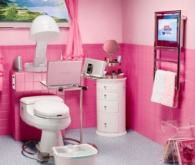 這是一款女性版豪華盥洗室,由美國(guó)Roto-Rooter潔具公司推出。其整體色調(diào)為粉紅色:“公主們”可以坐在粉紅色“寶座”(馬桶)上,一邊吹頭發(fā),一邊泡腳,一邊打開(kāi)粉紅色的Sony筆記本上網(wǎng),或者玩WiiTennis( 日本任天堂生產(chǎn)的一款運(yùn)動(dòng)游戲機(jī)),而且對(duì)于很多女性朋友來(lái)說(shuō),既是電視、鏡子,又是毛巾架的多功能屏幕,更是不可多得的“寶物”,此前該公司曾推出男性版超級(jí)盥洗室,其中配置的電視屏幕是女性版的4倍大。