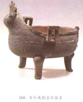 春秋、戰(zhàn)國時期出現(xiàn)的鼎式之一,仿青銅禮器,陶或原始青瓷制品,江南地區(qū)出土較多。北京故宮博物院收藏的原始青瓷獸首三足鼎,器形為廣口、窄沿、淺直腹、平底、獸蹄形三足?谘—側(cè)貼塑有直立的獸頭,與之相對一側(cè)貼短尾。獸首高昂,雙目外突,額上有雙角。在獸首與尾之間、有對稱的長方形折邊立式雙耳。(見圖168)