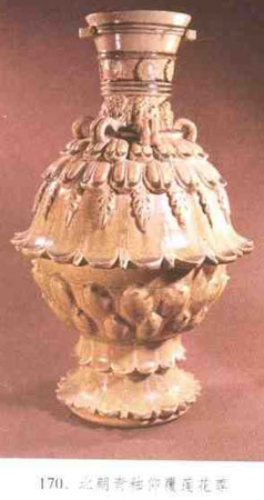 南北朝時期的一種青瓷尊,是順應佛教盛行而產(chǎn)生的器形。造型呈侈口、長頸、溜肩、鼓腹、外撇高圈足,肩部均勻分布6個直系。器身布滿堆塑的上覆下仰層層蓮花瓣、蓮瓣豐碩而高凸,其間還貼塑飛天與寶珠紋。全器造型宏偉,裝飾瑰麗,藝術水平相當高。(見圖170)