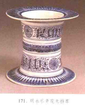 尊式之—,流行于明永樂、宣德時期。平沿,圓口、筒腹上下通透,底沿扁平與平沿呼應。器形明顯帶有異域風格、亦有人稱之為器座。清康熙、雍正、乾隆三代均有仿品。(見圖171)