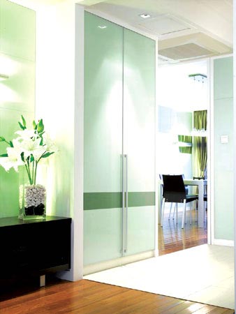 對于最普遍的90平米以下的小戶型來說,由于條件限制,進門處的玄關空間都挺狹窄。既然沒有那么多的空間可以揮霍,玄關設計還是應以滿足儲物收納等實用功能為主。主要是為了方便脫衣服換鞋帽,可以把鞋柜、衣帽架、大衣鏡等設置在玄關內。07年還是以低柜隔斷式為主,但細節(jié)處又有了新意。