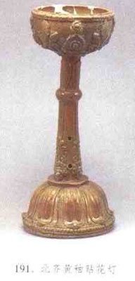照明器具;緲(gòu)成由燈柱、油盞和承盤3部分組成。東漢冥器有灰陶、釉陶制品。除單只燈形外,還有的燈柱上端托圓盤,盤內(nèi)立有張開雙翼的瑞鳥、燈柱四周有“S”形枝蔓,枝蔓根部貼有葉形紋,頂端托油盤。1958年出土于南京清涼山吳墓的青瓷熊燈、燈柱做成熊形,蹲坐在承盤內(nèi),頭頂和前肢托著油盞、承盤底刻有“甘露元年五月造”銘文。西晉時燈柱有熊形、人形,柱比三國時高一些。東晉南朝以后的油燈造型趨于簡樸,燈柱更加細長。唐代的無柱盞式油燈,移動比較方便。唐代四川邛窯生產(chǎn)的省油燈,構(gòu)思巧妙。明宣德時有壺式油燈、圓腹、高足、直流、壺帶蓋、立于承盤內(nèi)。曲柄上端與壺的肩部相接、下端與承盤相聯(lián)、燈芯從壺嘴內(nèi)伸出、壺腹部可貯油。(見圖191)