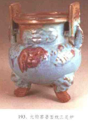 陶瓷焚香用具。也可作陳設(shè)之用。陶爐流行于漢,多為冥器。瓷爐始于三國,多為香熏。五代、宋始流行三足爐,造型摹仿古代青銅器,多用于陳設(shè)或焚香。器形有鬲式、魚耳、鼓釘、蓮瓣、三足、五足、弦紋爐以及熏爐等多種式樣。(見圖193)