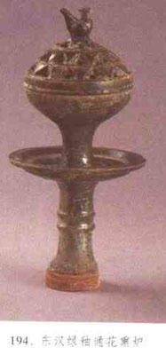 熏香用具。其歷史十分悠久,湖南長沙湯家?guī)X西漢張瑞君墓出土的銅質(zhì)器上,就有“熏爐”二字銘文。三國、兩晉時,貴族“無不熏衣剃面,傅粉施朱”。成為一時習(xí)俗,青瓷熏應(yīng)運(yùn)而生、并廣為流行。其造型三國時多斂口、扁圓腹、圈足、索耳,器身遍布大小不一的鏤孔,有的中心立—中段鏤孔的細(xì)筒,以置香料;西晉時多為球形香籠,下連三熊足及淺腹平底承盤,環(huán)腹壁橫列數(shù)層三角形氣孔,直口邊常堆塑飛鳥或圓珠;東晉器直口開闊,有的香熏呈上下開合式;并以支柱連接缽式承盤,平底無足。(見圖194)