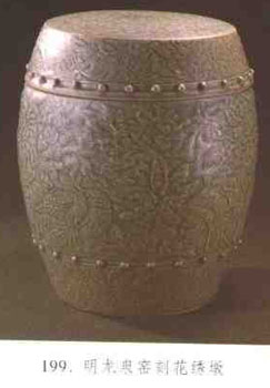 一種坐具。又有“坐墩”、“涼墩”之稱。歷來多作鼓形,平頂微凸、折肩、弧腹中空,外壁上下邊沿各飾一周鼓釘、故又稱為“鼓墩”。宋時已有制作,據(jù)清代乾隆時朱琰所著《陶說》載:“宋學士王瑋召對蕊珠殿,設紫花坐墩,命坐。”江蘇常州武進村南宋墓出土的朱漆鐵金菱花式奩,頂面人物畫背景中有鏤空繡墩形象。瓷質繡墩始見元于元,流行于明、清。明代墩頂面普通隆起,清代多為平面。據(jù)明人谷應泰所撰《博物要覽》記載,明代宣德朝器最為清美,“漏空花紋,填以五彩,華若云錦。又以五彩實填花紋,絢艷悅目。二種皆深青地子。有藍地填畫五彩,如石青剔花、有青花白地,有冰裂紋者。種種式樣,非前代曾有。”惜宣德繡墩傳世品尚未發(fā)現(xiàn)實物。(見圖199)