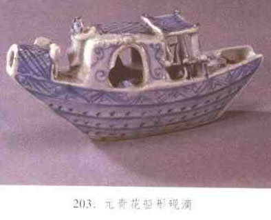 宋、元時期出現(xiàn)的新式文具。 為龍泉窯、景德鎮(zhèn)窯所燒制,形狀塑作船形、船中部、尾部有逢及身披蓑衣的艄工,船倉下部中空,船頭留有花形流水口,構(gòu)思精巧、制作精良。(見圖203)