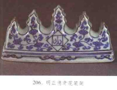 放置毛筆的文房用具,形如并列的山峰,故又稱筆山。元、明時期流行。北京元大都遺址出土的青白釉筆架,鏤雕成5座山峰形,山間浮云環(huán)繞,中間山峰上塑有朵云托日,山崖間布滿藤蔓,青竹挺拔.山間溪流中浪花飛舞,游龍嬉戲。1984年景德鎮(zhèn)御窯廠遺址出土了永樂釉里紅梅竹紋筆盒,也有筆架功能,器形為長圓形、平底、蓋與盒有子母口,盒內分成三格。正德時期的五峰山式筆架,下連須彌臺座。繪纏枝靈芝紋,兩面有菱形開光,內書波斯文“筆架”。萬歷朝筆架有長方形盒式。唇口沿外撇、四角內折、長圓形足、內有筆擱。有青花、五彩兩種。清代筆架形狀較為豐富,有盒式、山形和橢圓形數種。藝術水平超越前朝,如乾隆朝哥釉筆架。山峰做成玲瓏透雕狀,形似太湖石。(見圖206)