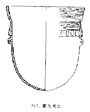 陶瓷容器底部形式之一,即圓弧形底,由器壁至底面作圓弧形過渡,無明顯轉折,底部無明確的平面。多見于早期陶器,新石器時代仰韶文化、馬家窯文化均有圜底的缽、盆、罐等。后代瓷器偶見圜底造型、如唐代青釉或三彩圜底缽盂。(見圖217)