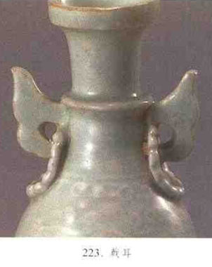 耳的一種式樣,因形似古代兵器戟而得名,主要流行于明、清景德鎮(zhèn)窯瓷器上,品種有青花、斗彩、仿官釉等;如明正德青花戟耳香爐、萬歷青花戟耳瓶、清雍正仿官釉戟耳瓶、嘉慶斗彩戟耳瓶等。(見圖223)