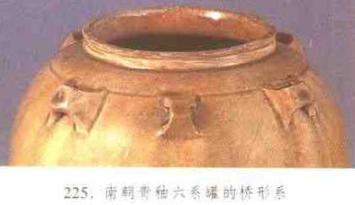 陶瓷器系的—種形式,造型似拱橋,外側為梯形,中有圓孔。流行于六朝青瓷罐、壺等器物上,有的器物橋形系與環(huán)形系并存。(見圖225)